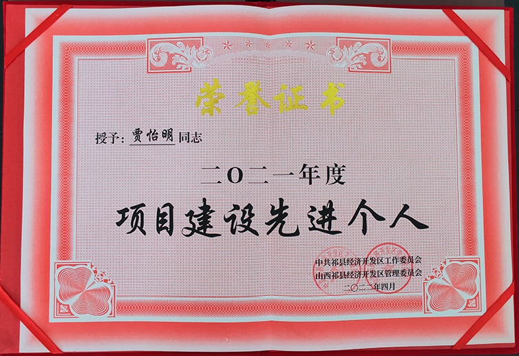 公司董事長賈怡明同志,在2021年開發(fā)區(qū)項目建設(shè)先進表彰大會上,被中共祁縣經(jīng)濟開發(fā)區(qū)工作委員會和山西祁縣經(jīng)濟開發(fā)區(qū)管理委員會共同授予“二〇二一年度項目建設(shè)先進個人”榮譽稱號。